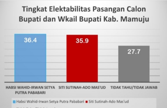 Ketika responden ditanya, seandainya pilkada Kabupaten Mamuju dilaksanakan pada hari ini (hari saat dilakukan wawancara), ujarnya, sebanyak 36,4 persen mengatakan mereka memilih pasangan Habsi Wahid dan Irwan Setya Putra Pababari. Sementara pasangan Siti Sutinah-Ado Mas’ud mendapatkan 35,9 persen.