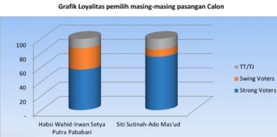 Selanjutnya jelasnya, loyalitas pemilih kedua pasangan bervariasi. Dari pemilih yang memilih pasangan Habsi Wahid-Irwan Setya Putra Pababari sebanyak 57 persen yang mengatakan tidak akan mengubah pilihannya. Sementara sebanyak 30 persen mengatakan dapat mengubah pilihannya. Sisanya 13 persen menyatakan tidak tahu/tidak menjawab.