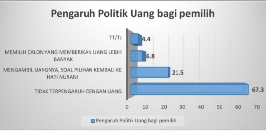 Dikatakannya, pengaruh Politik uang (money politics) di Kabupaten Mamuju, terdapat 67,3 persen mengatakan masyarakat tidak terpengaruh pilihannya karena uang.
